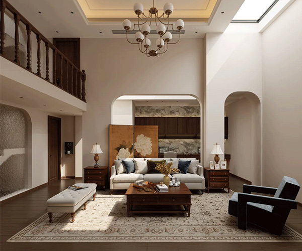 谁能拒绝一套把美式复古的优雅和轻奢质感揉得恰到好处的大宅呢?挑空客厅的复古吊灯洒下暖光,木质家具带着岁月的温润,每一处细节都在诉说 “经典永不过时” 的居住美学~